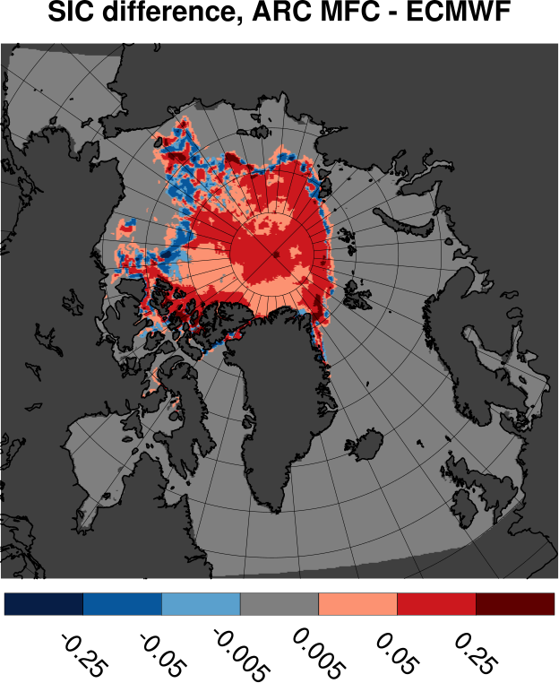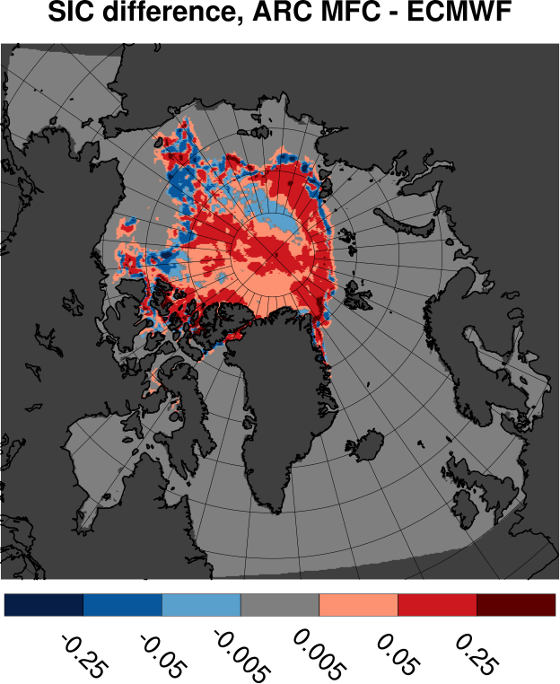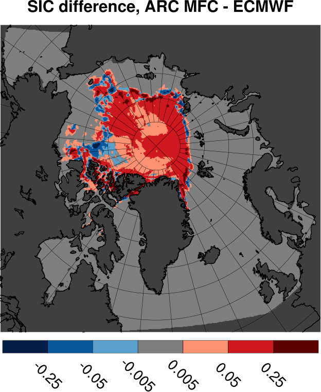 Tabulated values are computed by subtracting ECMWF results from ARC MFC results. All values are in units of Mkm2. Bottom row shows results for differences in sea ice area. Other rows shows area where the sea ice concentration differences fall inside the range given by the span in the leftmost column.