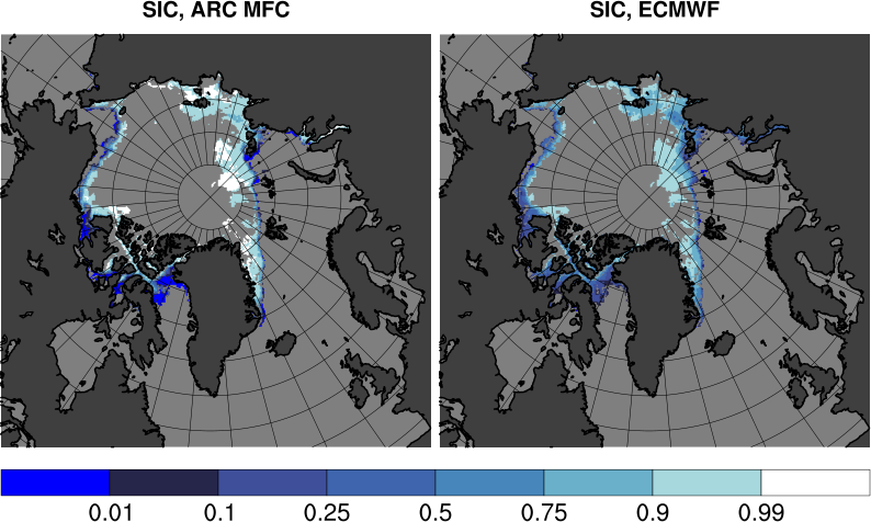 Tabulated values are computed by subtracting ECMWF results from ARC MFC results. All values are in units of Mkm2. Bottom row shows results for differences in sea ice area. Other rows shows area where the sea ice concentration differences fall inside the range given by the span in the leftmost column.