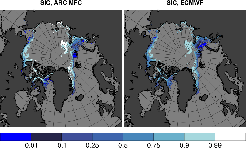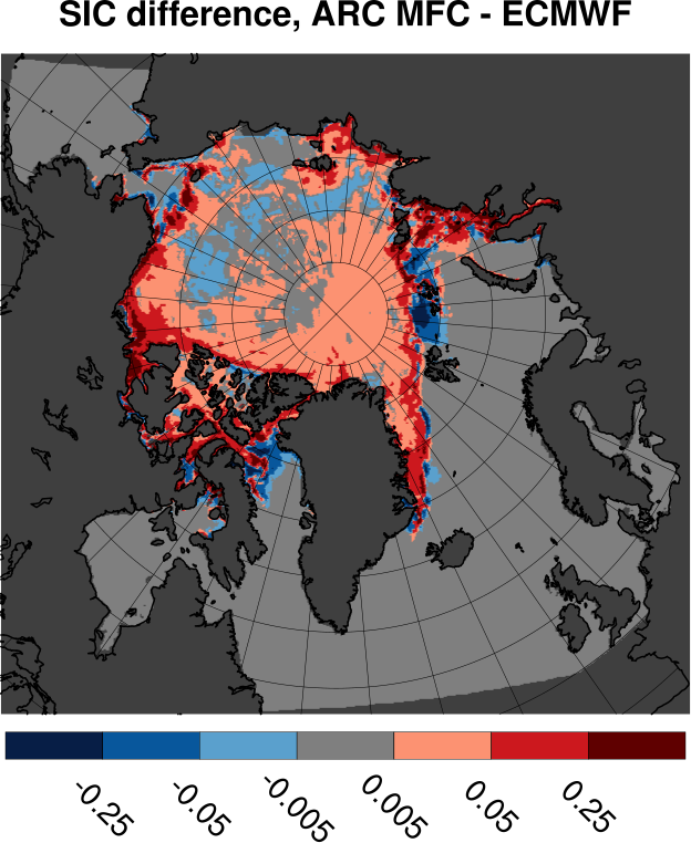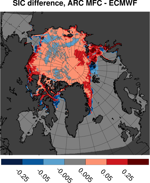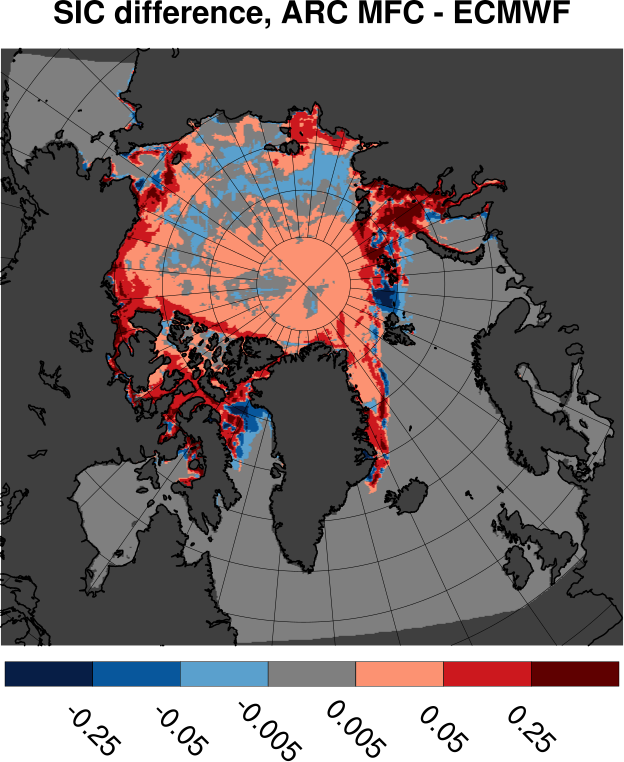 Tabulated values are computed by subtracting ECMWF results from ARC MFC results. All values are in units of Mkm2. Bottom row shows results for differences in sea ice area. Other rows shows area where the sea ice concentration differences fall inside the range given by the span in the leftmost column.