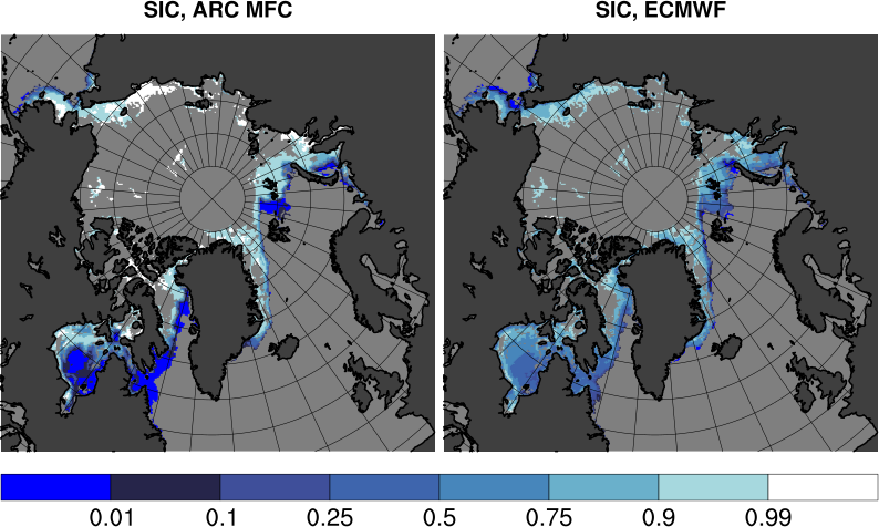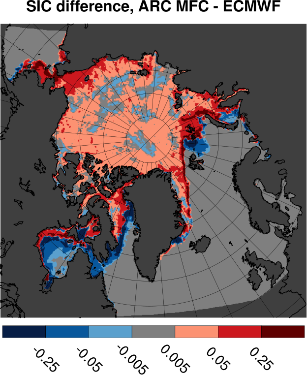 Tabulated values are computed by subtracting ECMWF results from ARC MFC results. All values are in units of Mkm2. Bottom row shows results for differences in sea ice area. Other rows shows area where the sea ice concentration differences fall inside the range given by the span in the leftmost column.